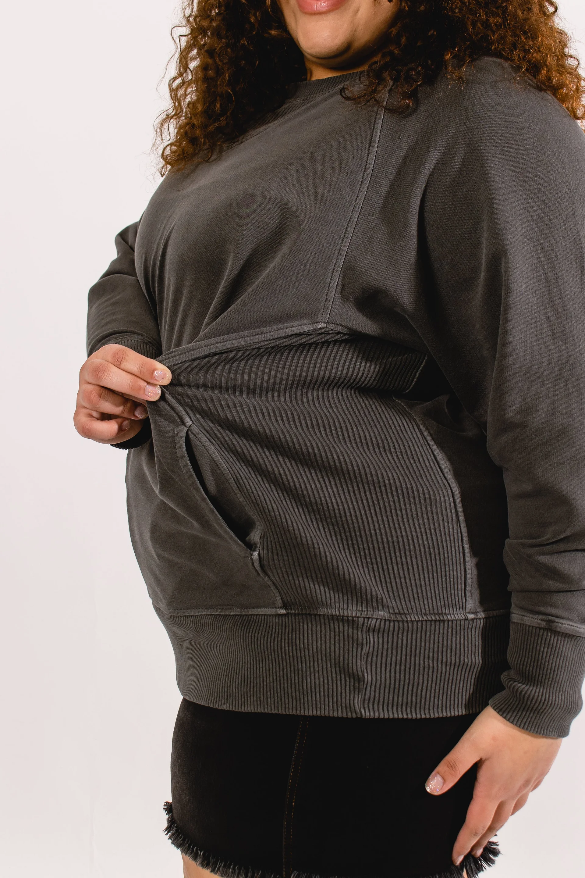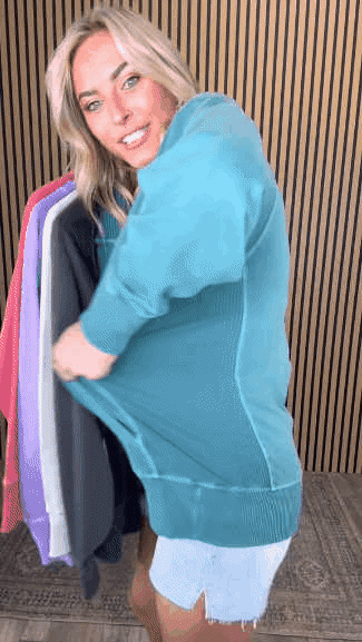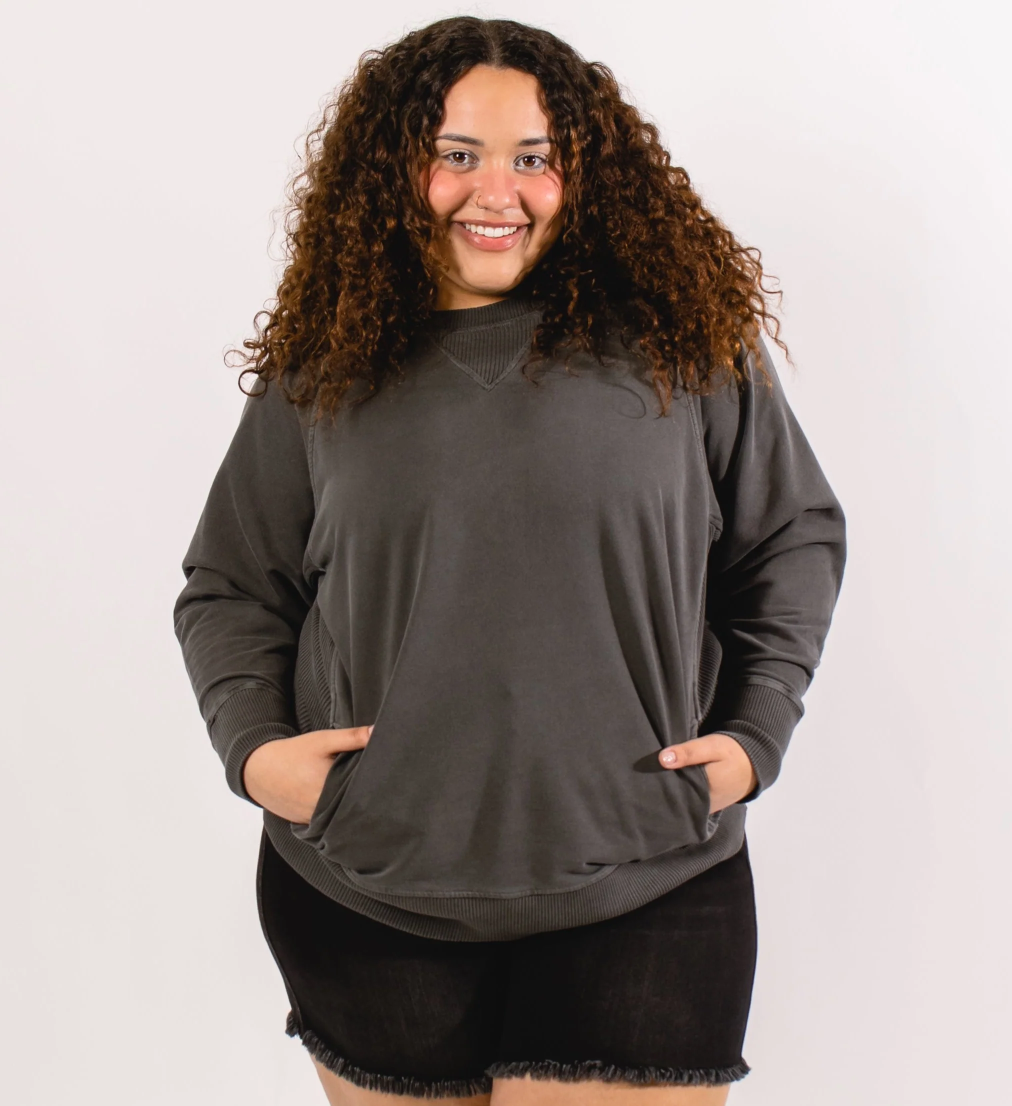 This pigment-dyed pullover top is a dream, with a soft, lived-in look and hidden pockets. The ribbed accents at the collar, neck, hem, and cuffs add a vintage feel. This fun piece is perfect for lounging, running errands, or anything your laid-back day brings. Hurry—this door buster won’t last!